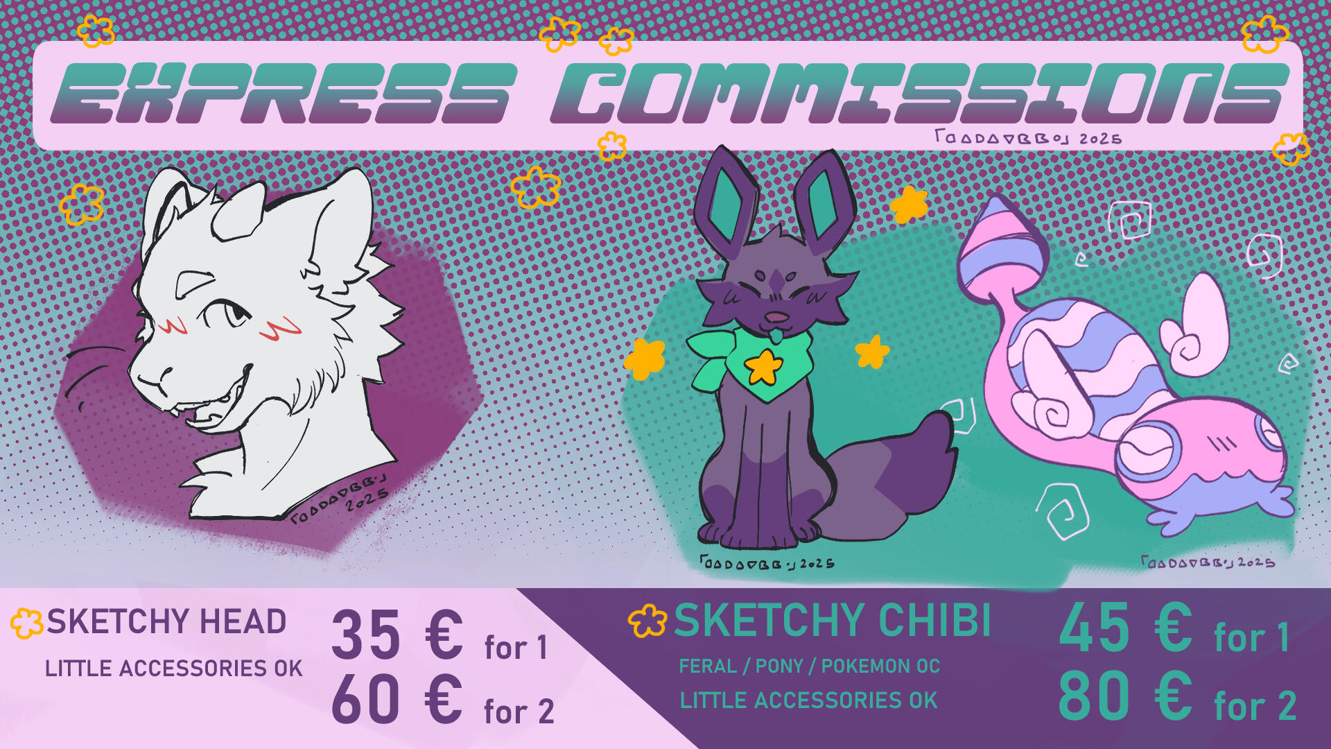 + 25€ per headshot+50€ per fullbody (anthro, feral, other)+70€ per clothed fullbody+25€ to 60€ per accessory+5€ little scribble (goofy sketch)